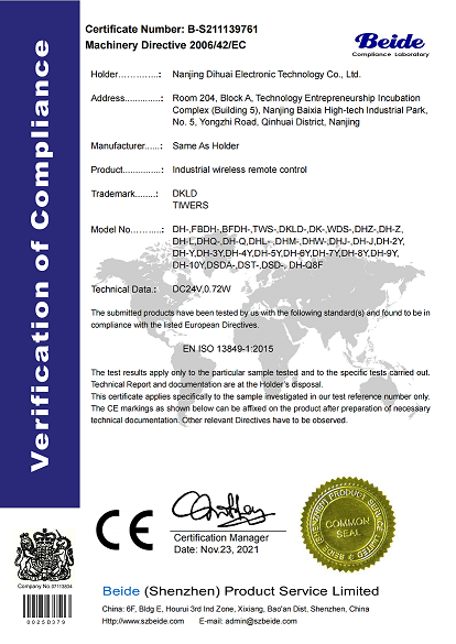 南京帝淮电子科技有限公司,国内工业遥控器行业领军企业,自主研发、定制、非标设计各类工业级无线遥控器、工业级有线控制器、智能化自主算法逻辑的本地控制器等系列产品。已经申请及正在申请的技术专利、外观专利有近三十项左右,并通过了CE欧盟认证、国家级试验检验报告、EMC电磁兼容认证等。