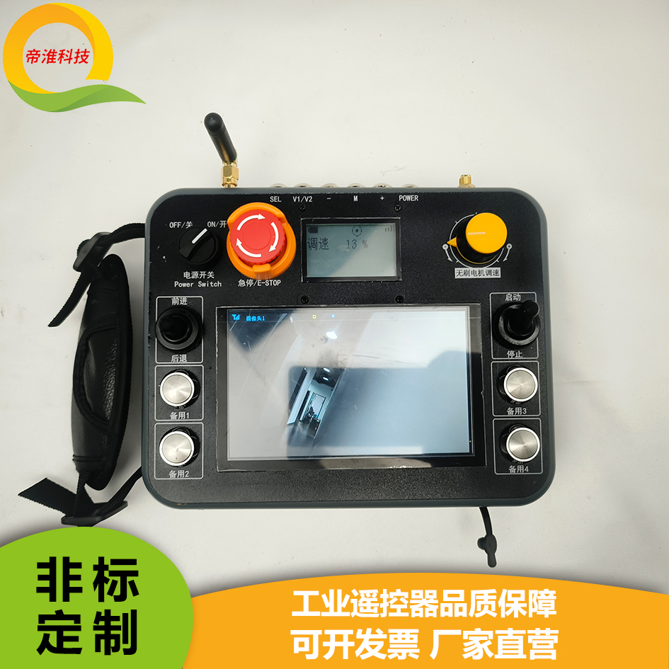 • 1个双轴摇杆+12个按键+1个两档旋转开关7寸触摸屏平板型工业无线遥控器